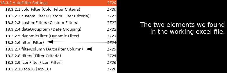 This photo shows that there is another tag called customFilters and customFilter but on the working example above these two are structurally the same. If we look a little further, there is a section (18.3.2) all about how autoFilters work in the XML.